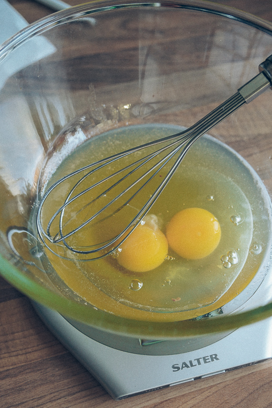 - Melt coconut oil, pour into a large bowl. Add eggs and your chosen sweetener, whisk.