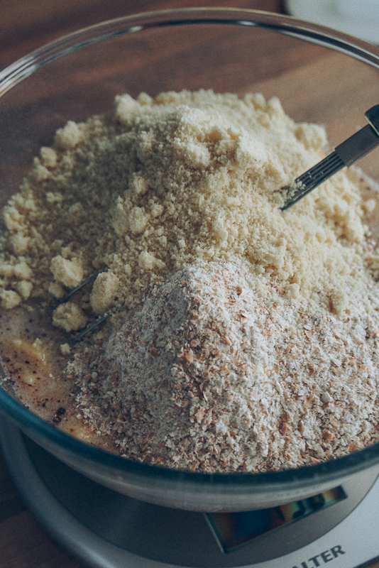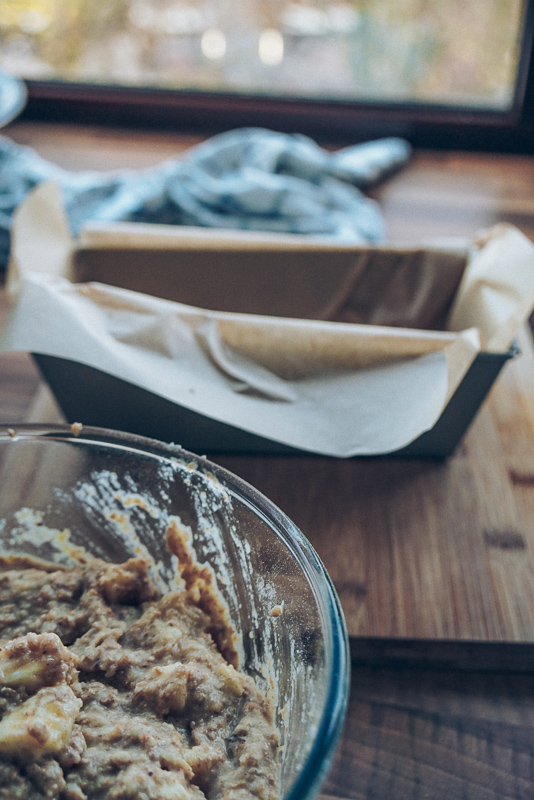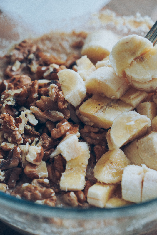 - Add flours and mix well with a spatula. Add 2 chopped bananas and walnuts, mix again and pour into a greased or baking-paper-covered loafpan.