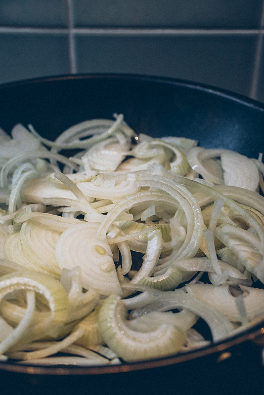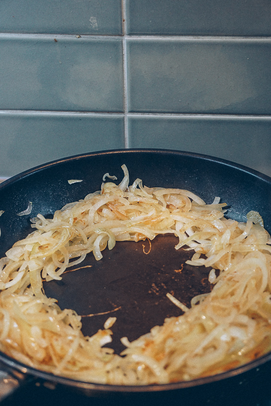 - Chop onions. When the oil is hot, lower the heat to medium-low, add the onions and stir until well coated. Cook until softened and golden. Remove from pan and save.