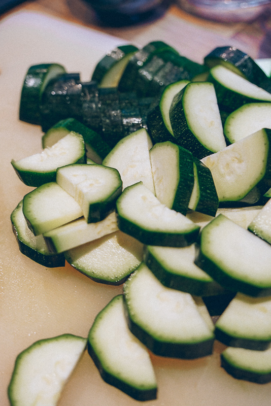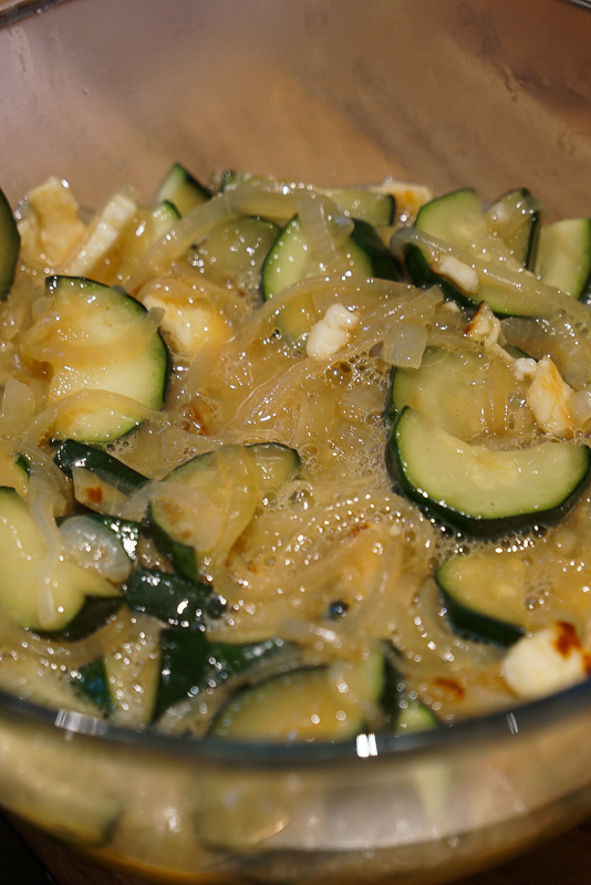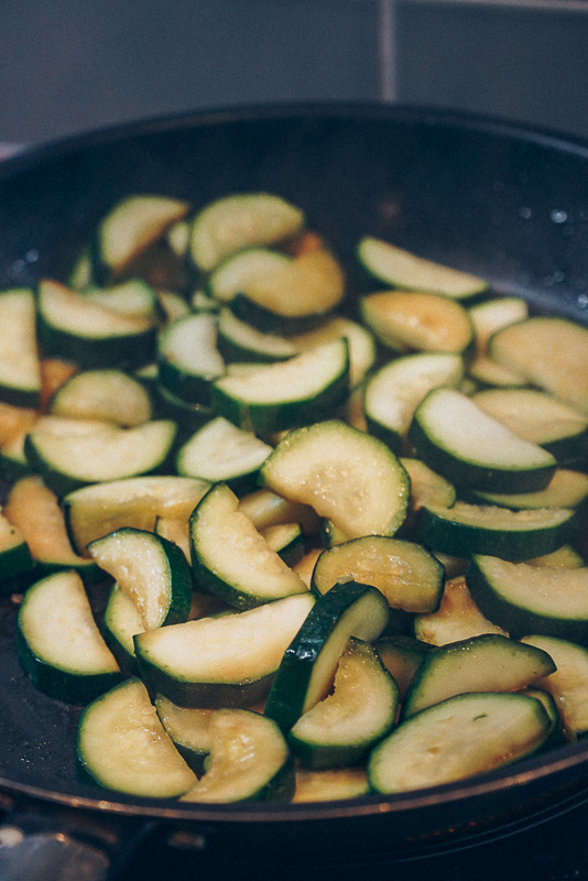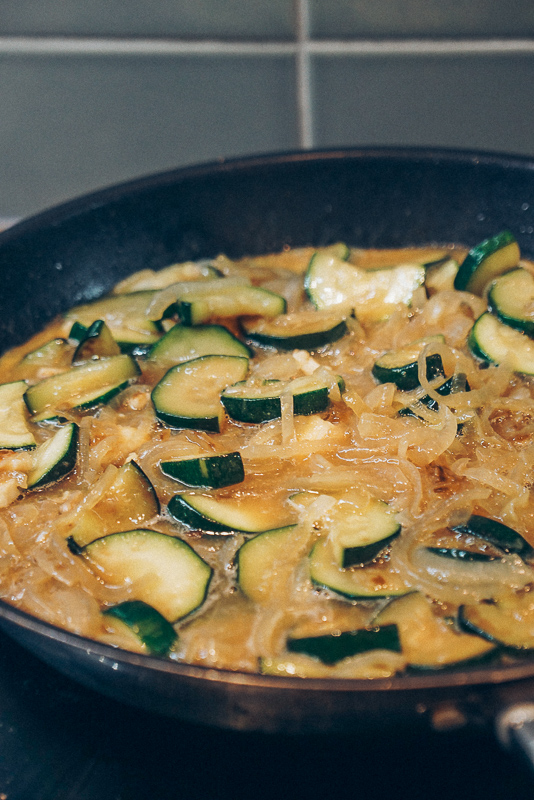 - Slice the courgette lengthwise, then chop each side into bite-sized pieces. When oil is hot, add the courgette and mix. If the courgette pieces start releasing water, increase heat to medium-high, otherwise they’ll become too soft (we want to fry the courgette, not boil it in its own water).