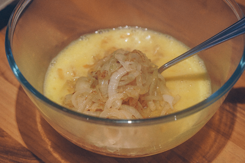 - In a large bowl, crack 4 eggs, add salt and pepper, then whisk well. Add the cooked onions, courgette and any optional ingredient – I used grilled halloumi. Mix well and let it rest for 5 minutes.
