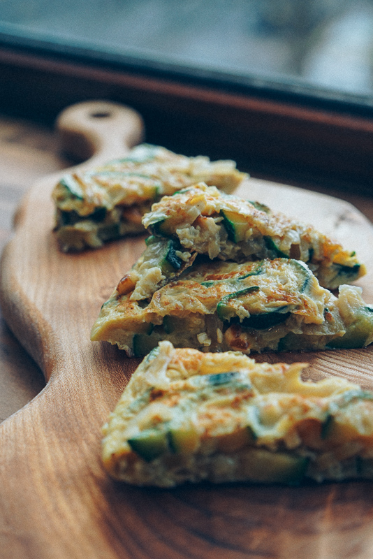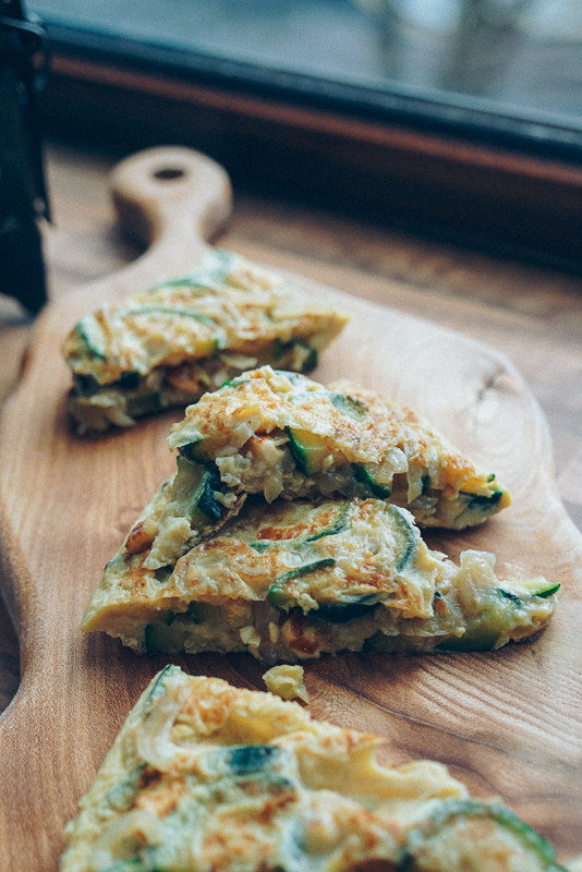 Omelettes are great leftover food and make for a nice, easy and quick dinner, especially those days where you don’t have the patience to make anything. I made this big courgette omelette and ate it during the next 2-3 days, for lunch or at night when I get home. I heat it up in the microwave for 1 minute, make a quick salad or heat up a cup of leek soup (if there’s any).