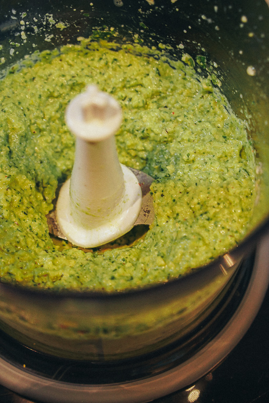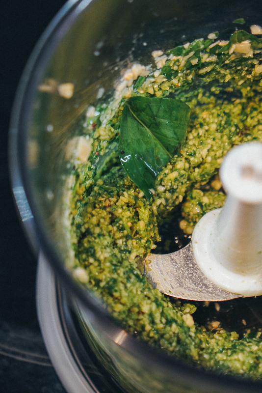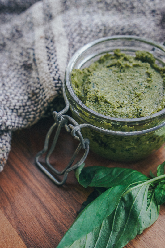 My version of the traditional pesto uses cashews (instead of pinenuts), there is no cheese (to make it vegan and slightly less salty) and instead of just using oil as the liquid binder, I use water too. This can make it creamier (less nutty) and softer, depending on how much you use, of course. I also added some lemons zest, as I read it in a recipe online and loved the nice sourness. You could also use a tiny bit of balsamic vinegar, it goes quite well too!