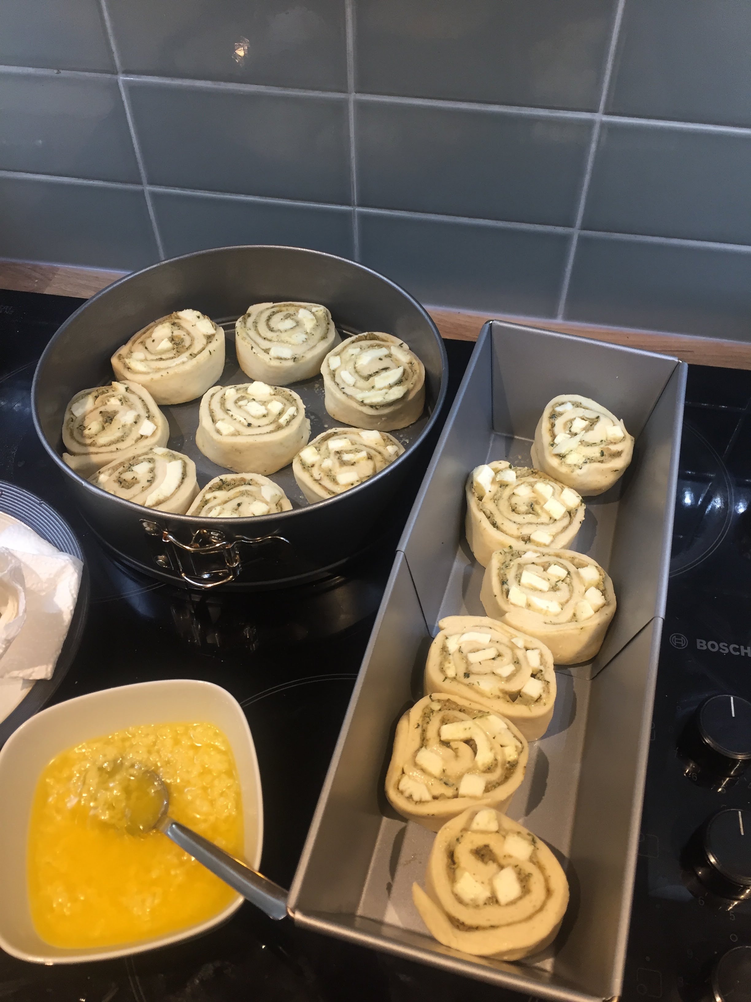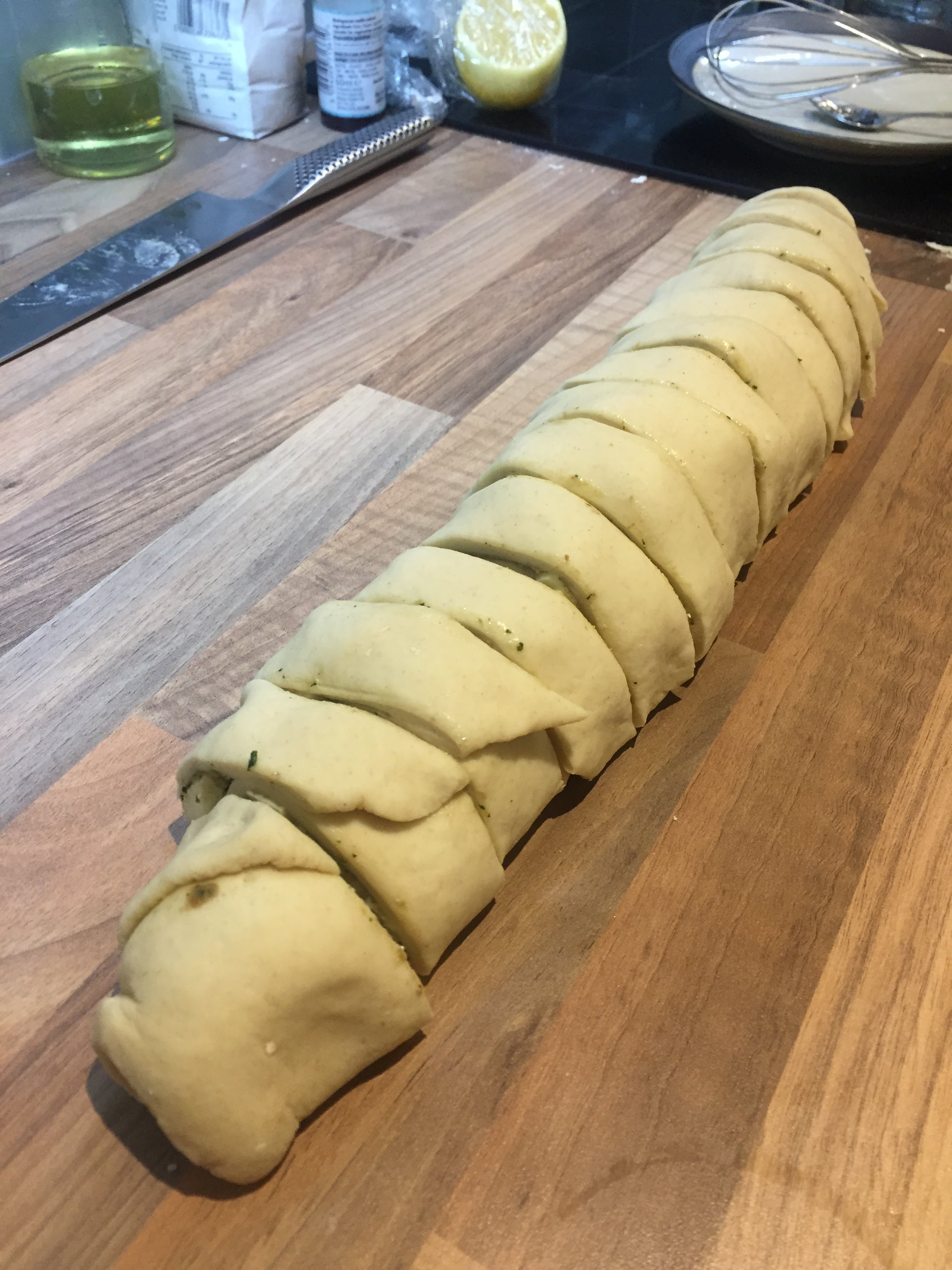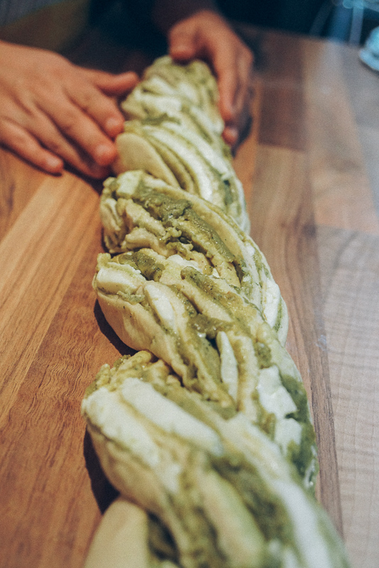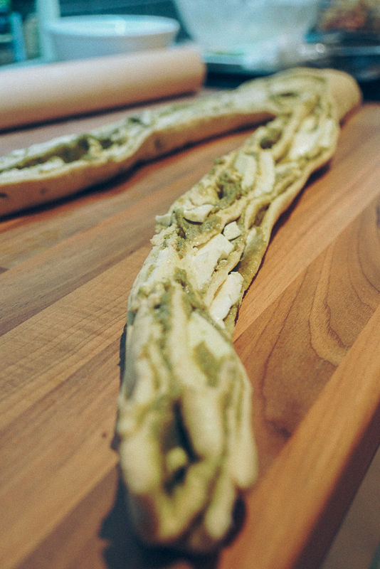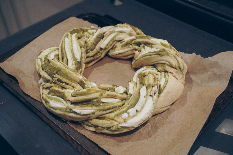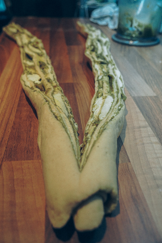 I will skip to the end: freakin’ delicious! As always, a few minor things I would change or do differently, but we got a pretty good result and had a bunch of friends a.k.a guinea pigs try it and approve it. I made it once more, because at the time we didn’t really take pictures, except for one or two with our phones (see at the bottom of this post). This time, although I made the pesto creamier, I kneaded the dough better, I let it prove longer… And instead of rolls, I went for a crown – and the result was a bit of a disaster! It didn’t look pretty or how I expected it to be, at all.